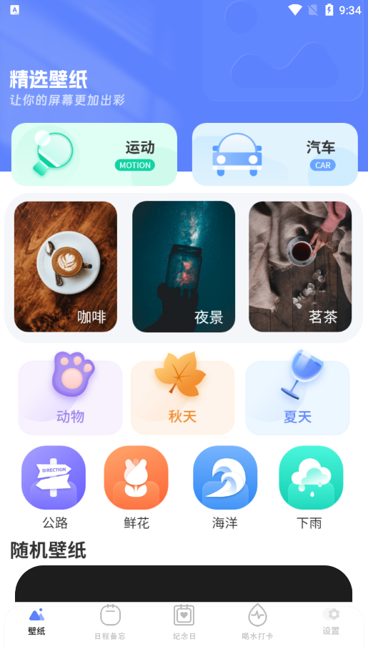 1、锁屏壁纸王软件将壁纸资源分为动物、汽车和风景等不同类别。