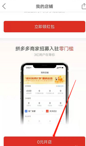 3、进入我的店铺界面,点击 “0 元开店”。