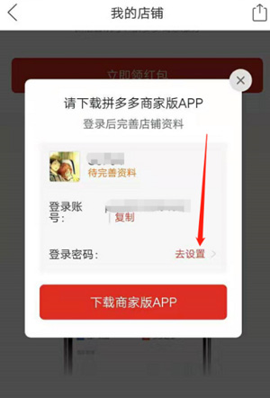 4、弹出 “下载拼多多商家版 app” 窗口,可先点 “去设置” 设密码。