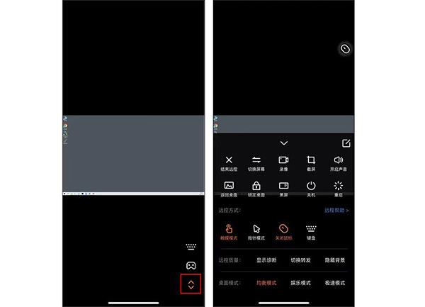 4、进入远控桌面后,可以通过远控工具栏执行一系列远程操作,点击远控界面右下角的【<>】图标即可打开工具栏。