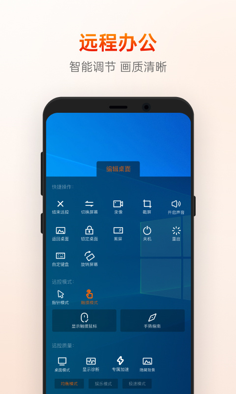 8、点击右下角的【箭头】图标,可快速执行【退出远控】、【开启录像】、【屏幕截图】等操作,同时可对远控方式、指针模式、远控质量和桌面模式进行个性化设置。