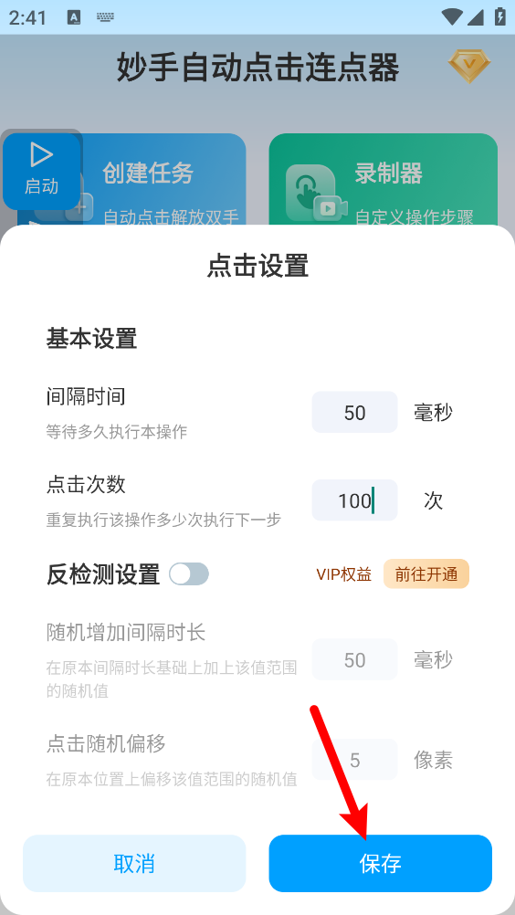 7、点击光标即可弹出设置界面,根据需求调整相应的点击参数,完成后点击“保存”。