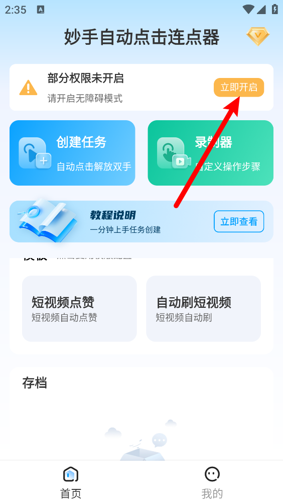 2、在首页点击箭头指向的“立即开启”进入下一步。