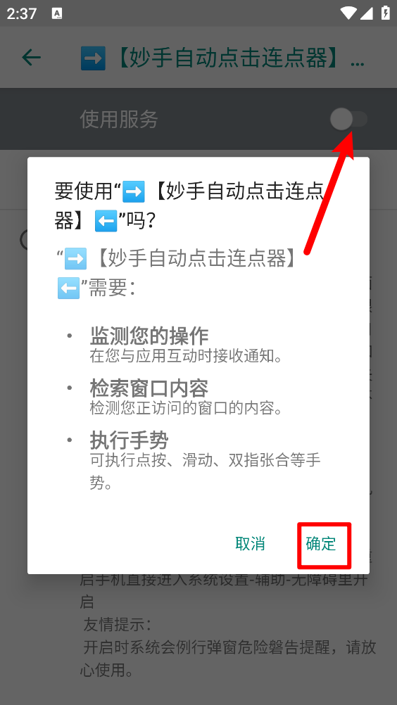 4、进入后开启使用服务,弹出提示框时点击“确定”,随后返回主页。
