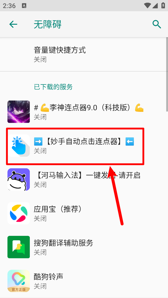 3、如图所示,自动跳转至无障碍设置页面,点击“妙手自动点击连点器”。