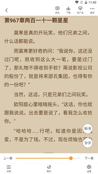 山顶阅读能够让我们所有喜欢看小说的小伙伴都可以在这里轻松阅读到自己喜欢的小说内容,而且在这里看最新的小说不会出现任何的广告弹窗,想什么时候阅读最新小说都可以在这里轻松的找到阅读,不管是玄幻小说、言情小说、科幻小说都可以在这里免费阅读,而且不仅可以在线看还可以简单的离线缓存哦,想找更多好看小说的小伙伴欢迎点击下载下来吧。