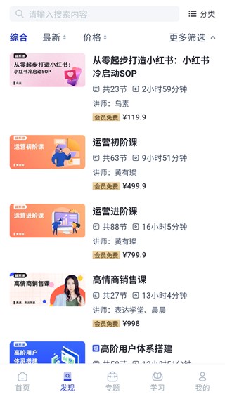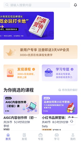 3、在“发现”频道,可以浏览到许多热门且时兴的行业课程。