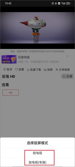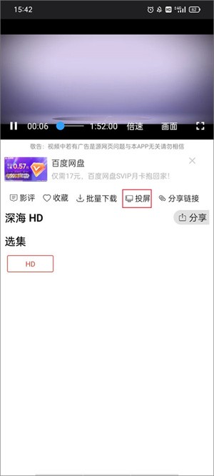 3、在播放界面下方会看到多个功能选项,点击其中的“投屏”按钮即可。