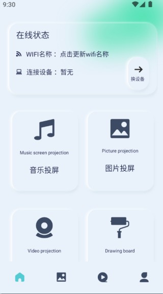 1、打开光影追剧免费观看软件,进入主界面,提供音乐投屏、图片投屏等多种优质功能,方便用户随时使用。