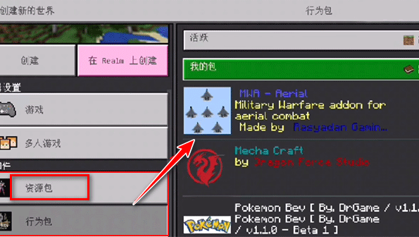7、返回游戏创建世界,在资源包选项里就可以看到并选择刚才下载的MOD模组了。