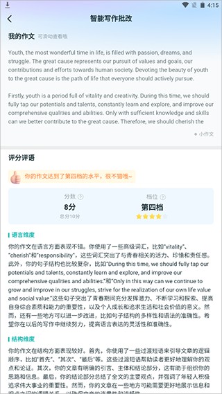 2、完成一键式作文批改,提供打分、批注、纠错、汉英润色等功能,帮助用户快速提高写作水平。