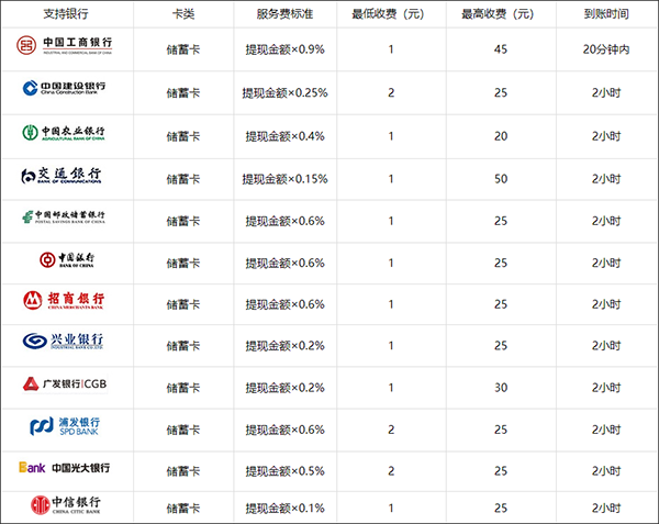 1、费率范围:目前支持12家主流银行(如农业银行、工商银行、建设银行等),提现手续费根据提现金额的 0.1%-0.9% 来收取。