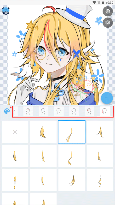 2、进入画像编辑界面后,可以对眼睛、嘴巴、手、头发、衣服等各个部分进行二次创作;