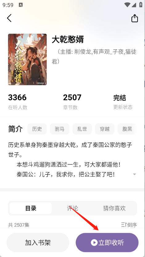 5、打开想收听的内容进入详情页,点击“立即收听”即可开始听书模式。