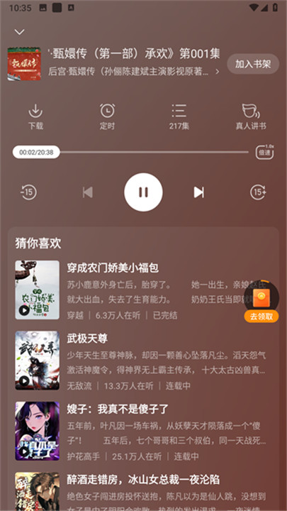 4、如果你想收藏你正在听的内容,点击右下角的书架图标,将该书添加到你的个人收藏中,这样你就可以快速找到它,以后继续听。