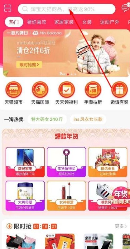 1、先打开一淘最新版本app,在首页的搜索框中输入你想购买的商品关键词。
