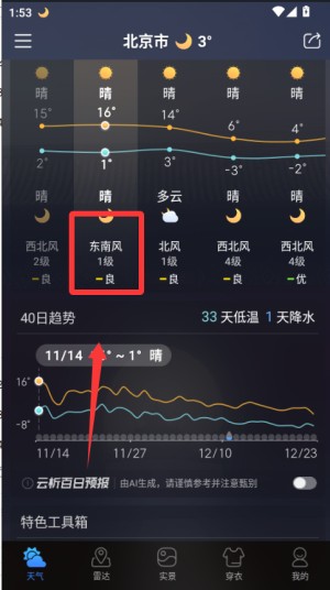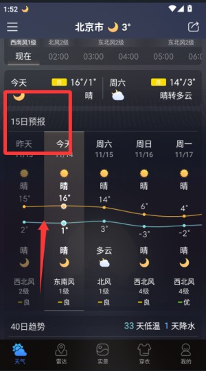 3、滑动界面可以查看未来24小时的温度变化曲线以及15天的长期天气预报,及时掌握天气趋势。