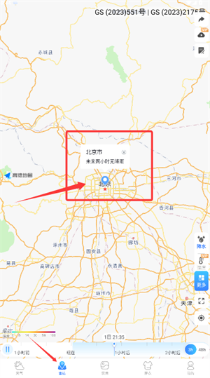 3、切换到雷达图页面,可以观察所在区域的降水分布情况和天气变化的动态趋势。