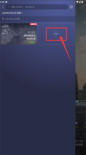 1、打开实时卫星天气预报免费版应用后,点击添加城市的“+”图标,就可以增加想要查询天气的城市。