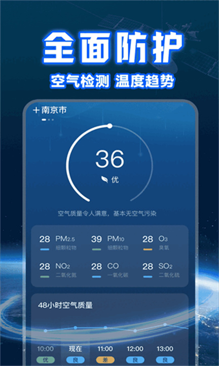 1、实时监测PM2.5、PM10等空气污染物浓度,提供详细的空气质量指数(AQI),帮助用户做好健康防护。