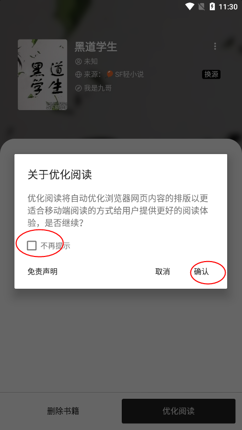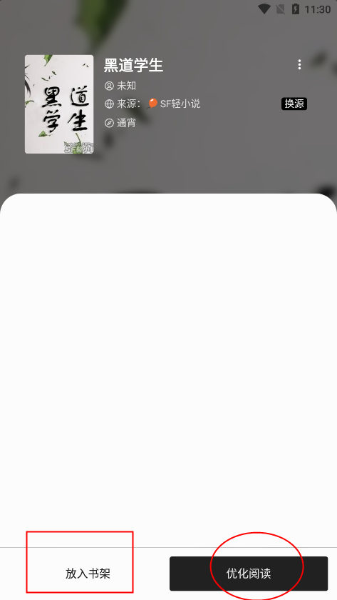 4、在阅读界面可以进行优化阅读或者将小说加入书架,也可以先加入书架再继续阅读;