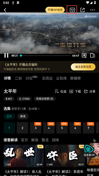 3、进入视频播放界面,点击右上角的“TV”投屏图标。