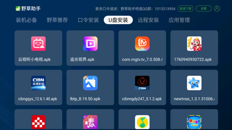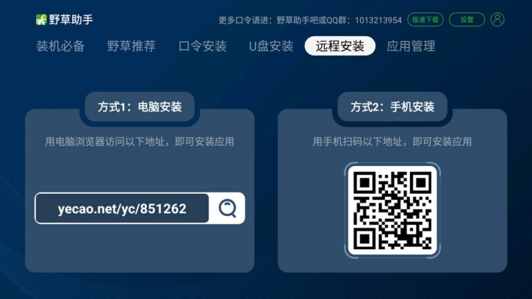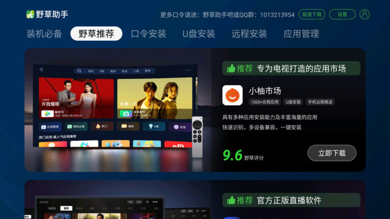 1、野草助手智能电视端可以通过输入四位软件口令来完成软件安装。