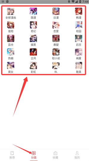 2、进入亲亲漫画应用后,点击底部的分类栏目,就能看到国漫、日漫以及冒险等多种题材选项。