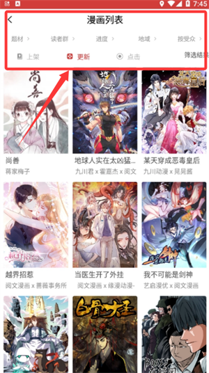 1、在漫画列表界面,你可以按照题材类型或适合的读者群体等条件进行筛选查找。