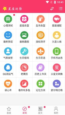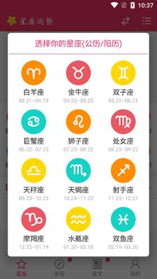 星座运势软件是一款和星座有关的娱乐app,软件界面很简洁,内容被制作的很好,在这个软件里用户可以快速的找到自己的星座,并进行观测,每个星座的运势都不同,用户可以使用这个软件去观察每个星座的性格和心理测试,满足用户们一些需求,给自己增加心里暗示,提升自信度,是一款很不错的娱乐软件,感兴趣的用户可以下载试一试。