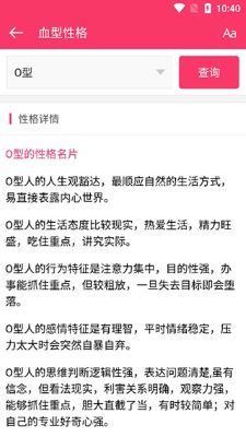 3、在主界面点击“血型性格”,输入要查询的血型,点击“查询”,即可查看相关信息。