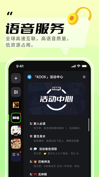 4、KOOK高品质语音功能,稳定流畅,占用率低,单通道内最多可同时通话25人。