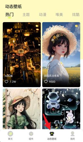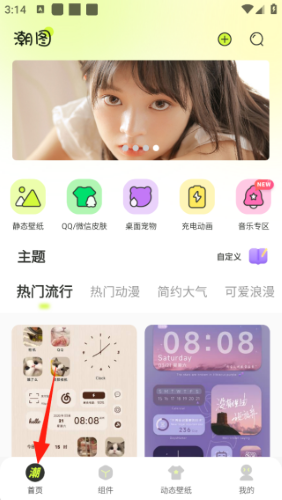 1、进入潮图壁纸首页后,可以浏览流行的个性化内容资源,如静态壁纸,皮肤,桌子宠物和充电动画。