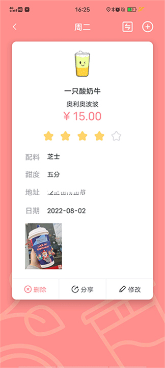 2、跟其他奶茶爱好者一起来交流点评奶茶,以免在选购奶茶时犯错误,也可以随时分享购买和制作奶茶的技巧。