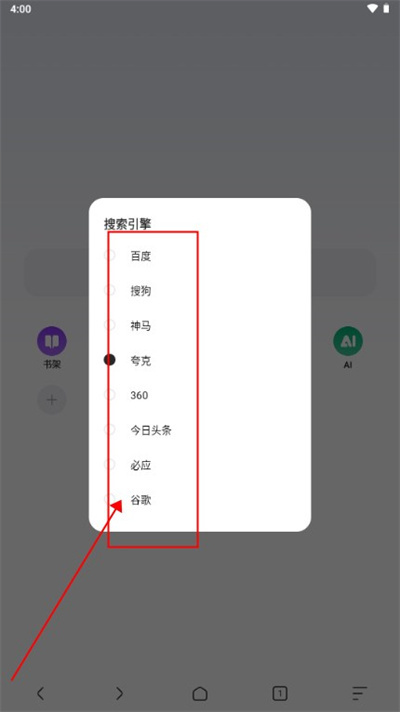 在这里你可以切换百度、搜狗、神马、夸克、360、今日头条、必应、谷歌。