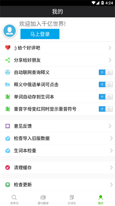 4、在“我的”界面中,用户可以手动设置联网查询释义,还可以点击释义中的俄语单词查看详细信息,同时可设置自动保存生词本,非常便捷。