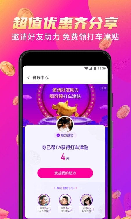 1、花小猪打车一口价分享保费优惠,邀请朋友帮忙,瓜分高额奖金。