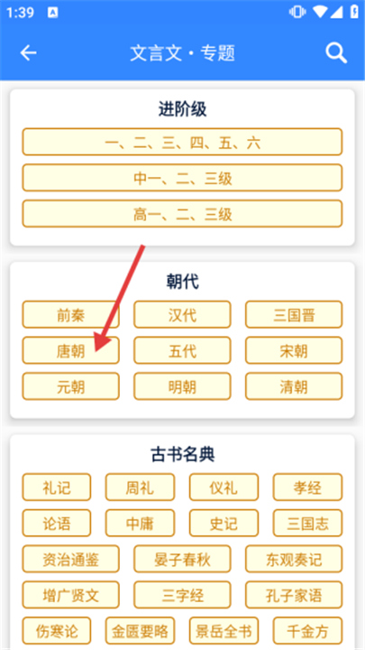 2、在文言文专页中,选择一个朝代(如【唐朝】),即可查看该朝代对应的文言文内容。