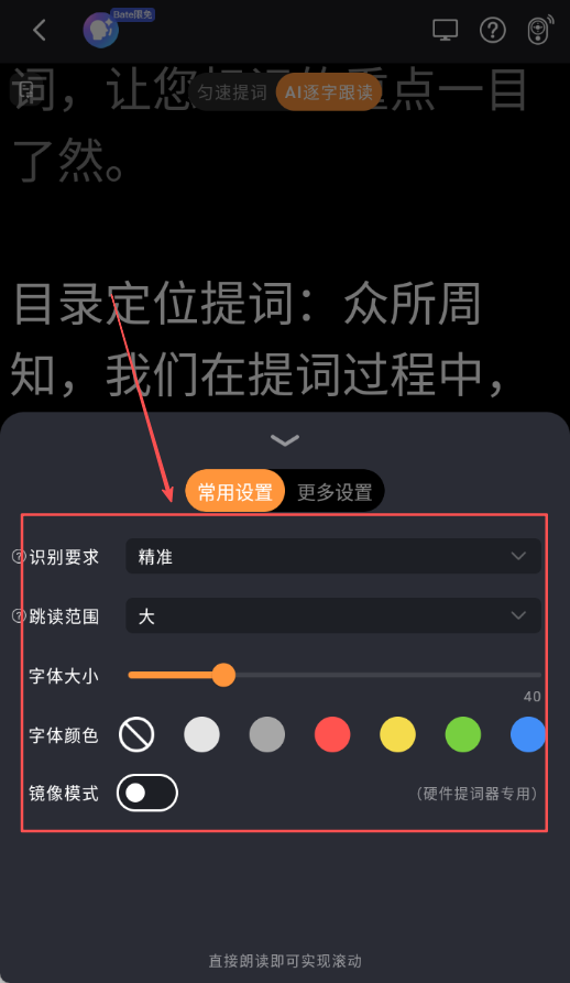 4、通过右下方的【设置】按钮进入配置页面,可调整滚动速度、字体大小以及镜像模式等参数,以满足不同场景的使用需求。