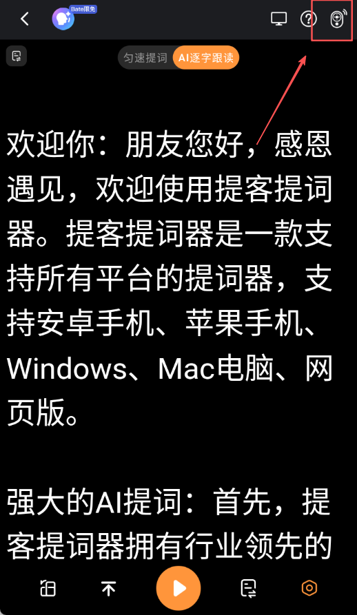 3、点击屏幕中央的【播放】按钮,即可切换到提词器模式,开始使用提词功能进行正式录制或演讲。