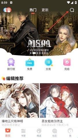 1、进入乐可漫画在线阅读免费版首页后,点击右上角的放大镜图标进入搜索功能。