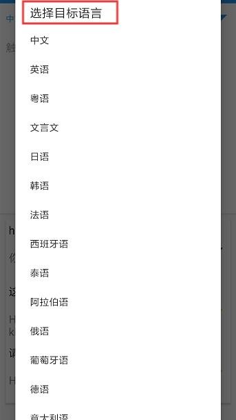 2、单击语言选择栏,将弹出目标语言列表。从中选择所需的翻译目标语言以完成语言配置。