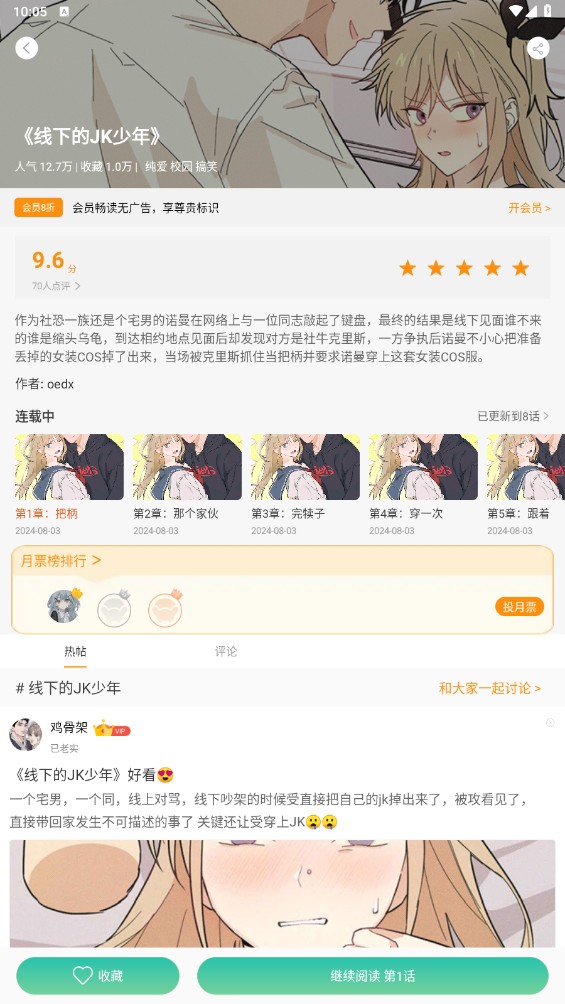 3、点击进入漫画详情页后,用户可以立即开始阅读,也可以将漫画收藏到书架,以便下次快速查看。