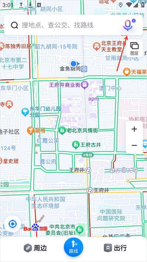 1、进入百度地图2026最新版App后,点击顶部搜索框右侧的语音按钮;
