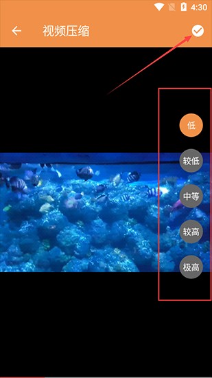 3、在视频压缩界面的右侧,设置所需的压缩质量,然后点击右上角按钮确认。