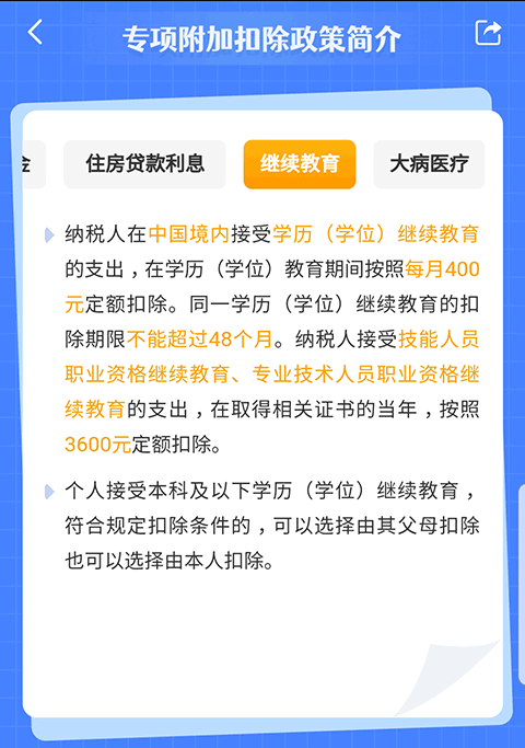 纳税人在中国境内接受学历(学位)继续教育的相关支出,在学历(学位)教育期间可按每月400元定额扣除。若纳税人参加技能人员职业资格或专业技术人员职业资格继续教育,则在取得证书当年可一次性按3600元定额扣除。
