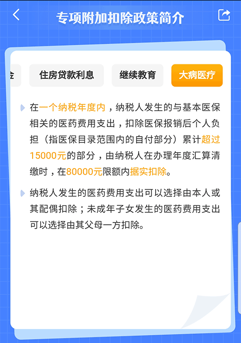 纳税人在一个纳税年度内,因基本医保范围内的医药费用支出,扣除医保报销后个人实际承担部分(即医保目录内自付金额)累计超过15000元的部分,可在办理年度汇算清缴时据实扣除,但扣除上限为80000元。