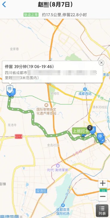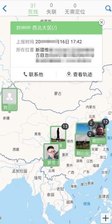 5、员工分布界面实时显示员工的所在位置。由于员工分布在全国各地,可以清晰看到他们当前的位置情况。放大地图后,还能精确查看每位员工打卡后的具体位置。