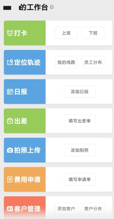 1、在本站下载并安装小步外勤软件后,打开它。界面如图所示,就是小步外勤工作台。打卡、定位、轨迹、客户管理、拜访以及工作汇报等功能都集中在这里,一目了然。