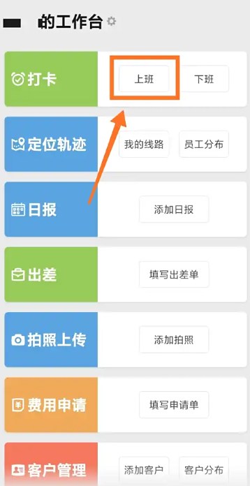 2、找到【打卡】标签,点击“上班打卡”即可开始打卡。可以选择在公司打卡,也可以在客户现场打卡。同时,管理员可以在电脑端后台设置打卡区域,确保员工确实在指定地点进行考勤。